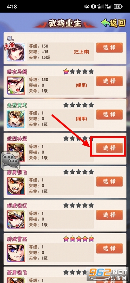 然后找到自己需要重生的武将点击右边对应的【选择】;