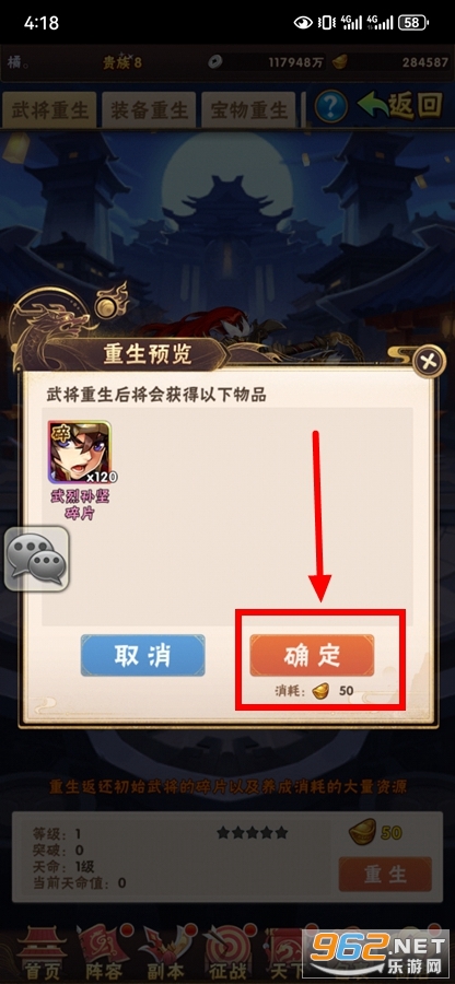 再点击破【确定】即可花费50元宝将武将变成碎片。