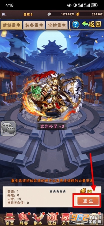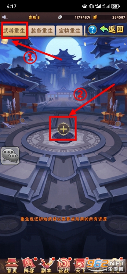 在弹出的页面选择【武将重生】,再点击中间的【+】;