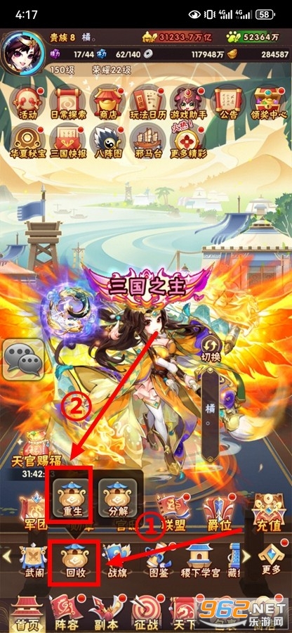 进入游戏主界面后,点击最下方的【回收】,在弹出的小窗口选择【重生】;