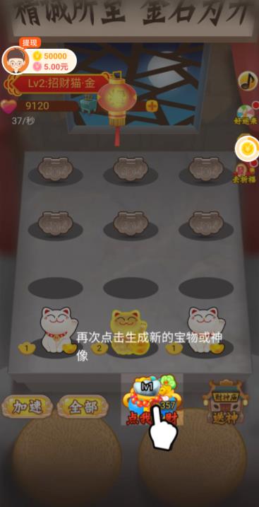 财神天天见红包是一款非常优质的休闲模拟类手游,游戏中玩家们将要寻找传说中的财神爷,你要好好地侍奉他,让他来年能够帮助你赚取更多的钱,你可以通过升级财神的方式来获得大量的红包。财神出现在新春里,玩家提前准备好各种各样供品,财神到持续合拼外型不一样的财神,当财神的级别提高,挣钱能力也会大大提高,每秒钟批量生产金币,而且达到目标任意坠落的钱夹很丰富。