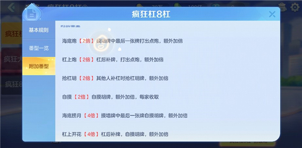 附加番型共有六种,玩家打出时会额外加倍。