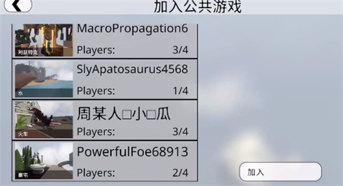 加入公共游戏的话,会显示一个房间列表,选中后加入按钮即可。