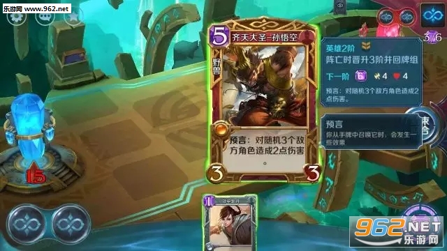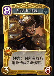 出场自带AOE预言效果,翻盘小能手伏羲给过我们太多的惊喜。即便对手强势战场,如果角色牌血量稍有不过关,伏羲就能发动团灭翻盘给你看!当然,这张金卡获取颇有难度,打到最强王者才能拥有哦~
